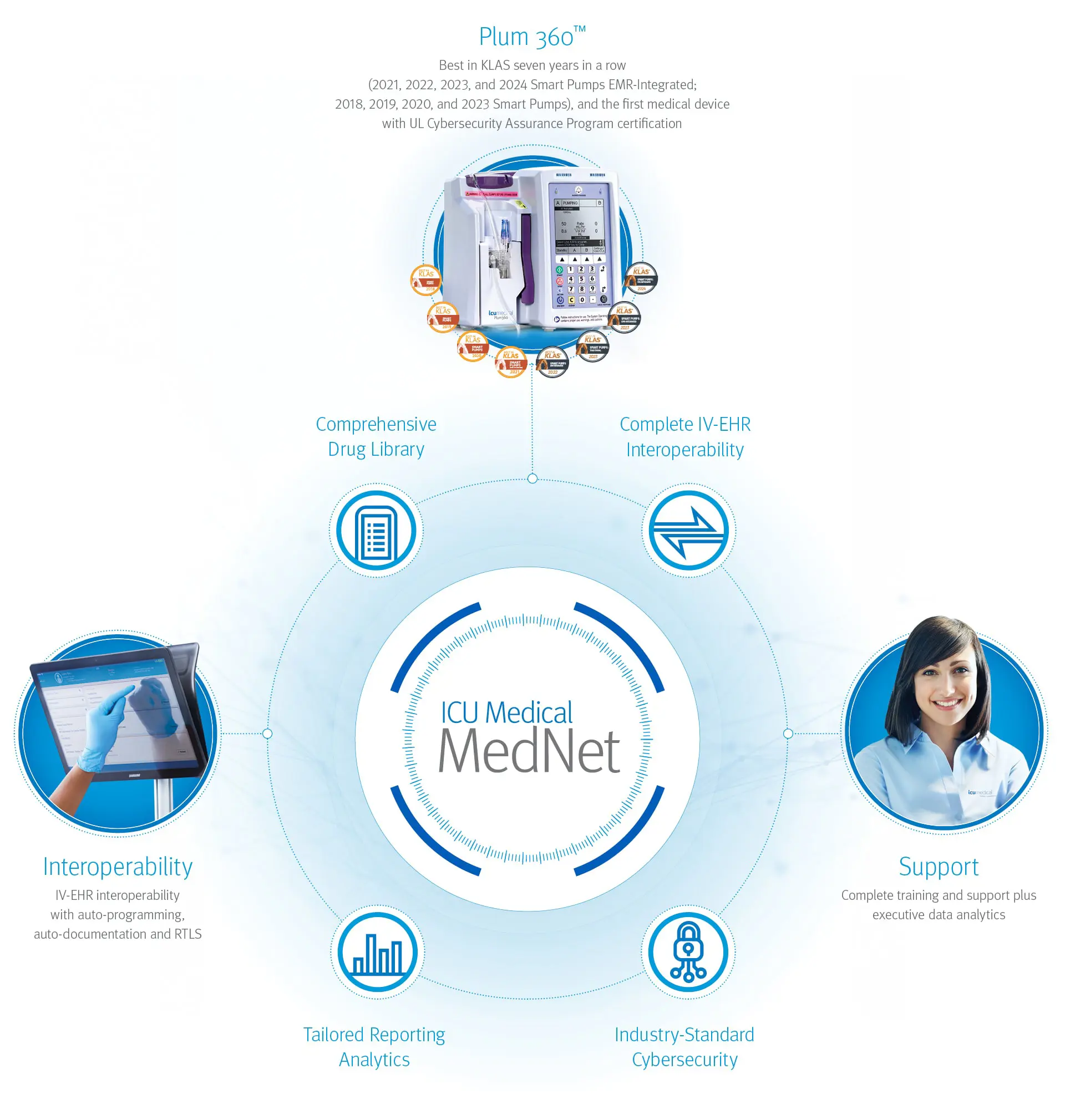 ICU Medical MedNet is an enterprise-class IV medication management platform for any sized healthcare system that can help you reduce medication errors, improve quality of care, streamline workflows, and maximise revenue capture. ICU Medical MedNet is the vital link that connects our industry-leading IV smart pumps to your electronic health records (EHR), asset tracking system, and alarm notification platform.