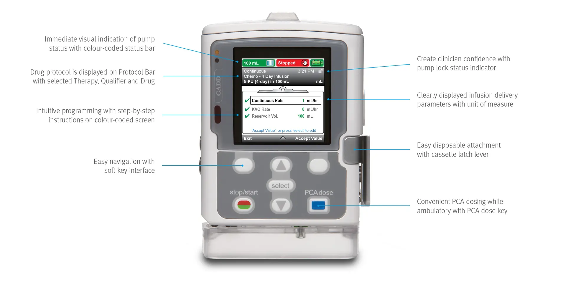 The CADD-Solis VIP ambulatory infusion pump helps support patient mobility with a small, portable design, easy-to-use interface, and intuitive help screens that assist with troubleshooting and can help reduce clinician visits. Colour-coded screens provide instant status of therapy progress, while CADD reservoirs support medication security and free-flow protection of fluid delivery. With five versatile delivery modes, the CADD-Solis VIP ambulatory pump helps you provide infusion care from the comfort of home.