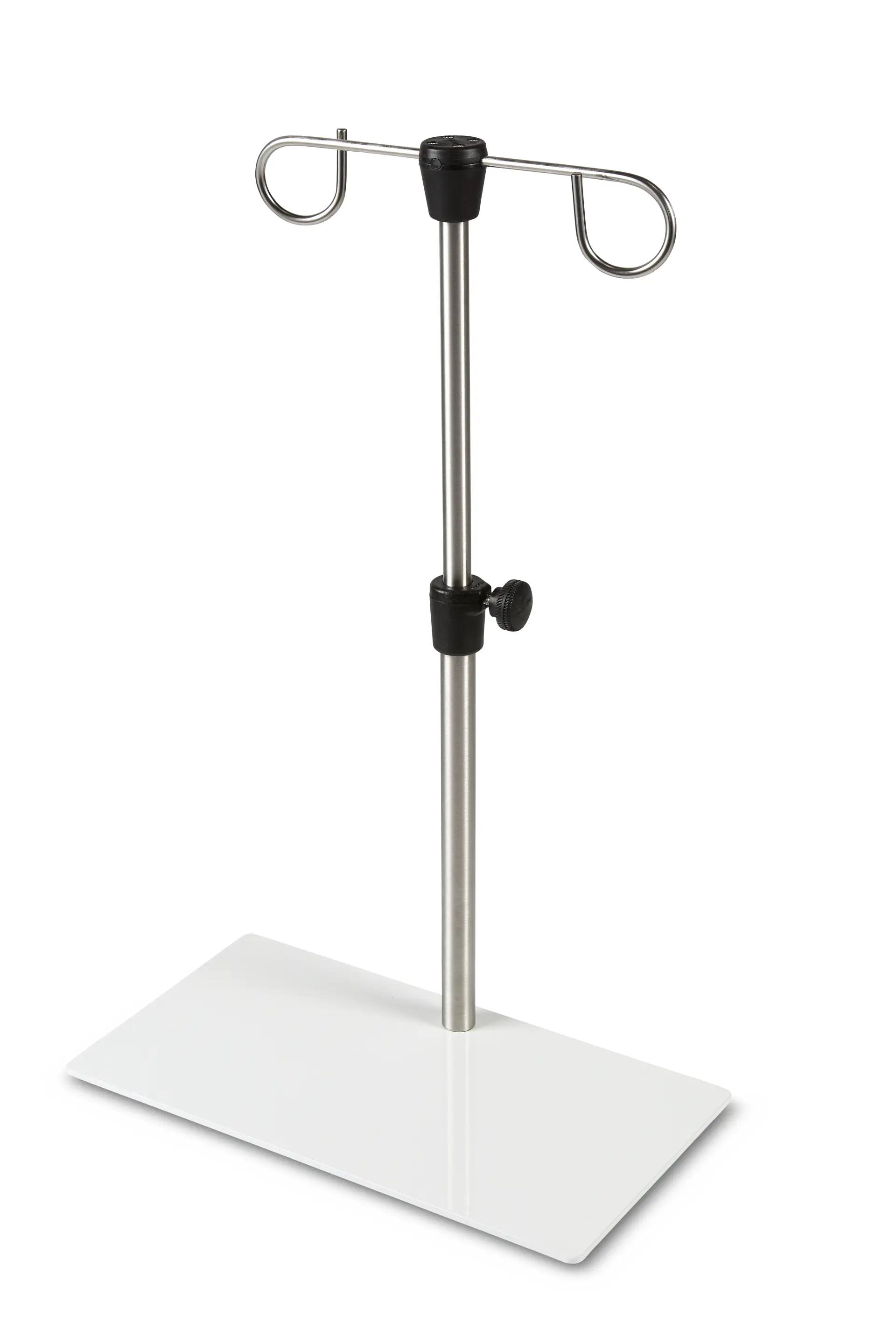 - Aluminum base 8”X15” for light weight pumps and small litter IV bags. Sky white powder coat Finnish. Telescoping IV Pole with 2 stainless steel hooks slow descending inner pole. 27” fully extended 15.50” compressed.Product Inquiry