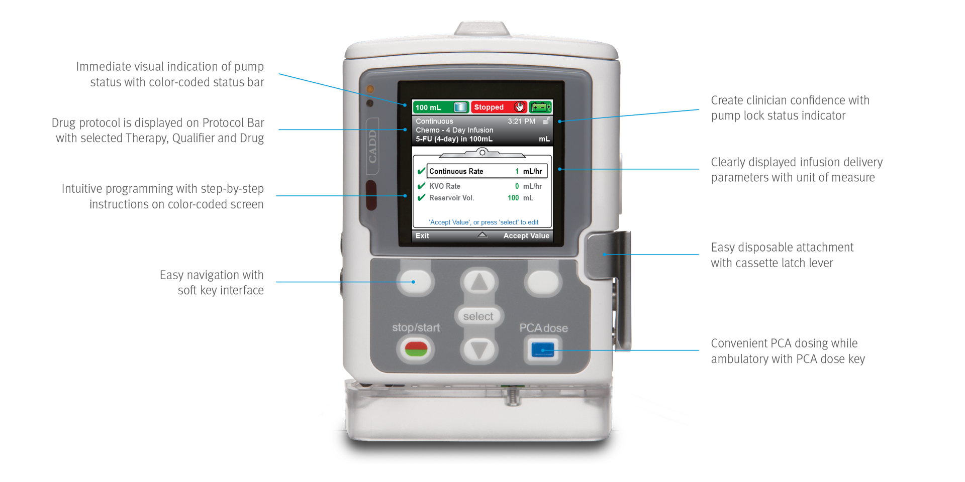 The CADD-Solis VIP ambulatory infusion pump helps support patient mobility with a small, portable design, easy-to-use interface, and intuitive help screens that assist with troubleshooting and can help reduce clinician visits. Color-coded screens provide instant status of therapy progress, while CADD reservoirs support medication security and free-flow protection of fluid delivery. With five versatile delivery modes, the CADD-Solis VIP ambulatory pump helps you provide infusion care from the comfort of home.
