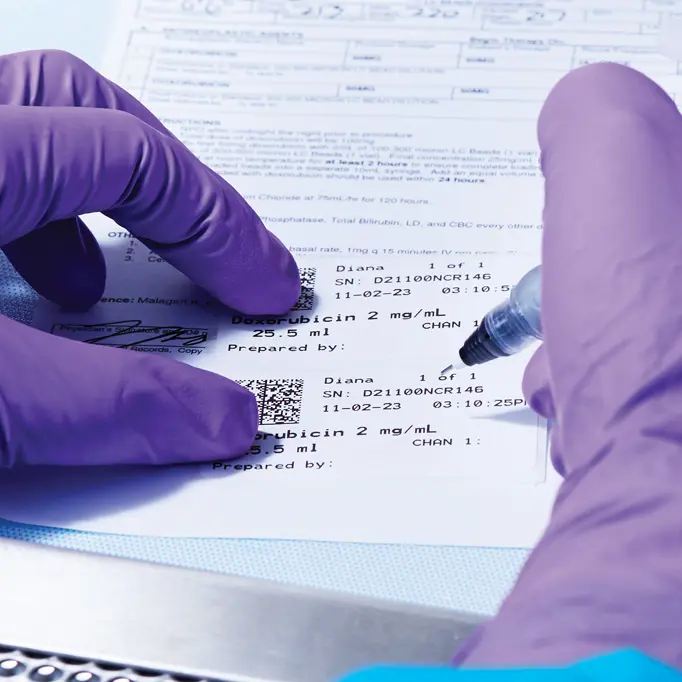 After each mix is completed, the Diana automated compounding system sends the medication name, volume, time, and date to a printer that creates up to five labels containing preparation information to complement your validation and quality assurance process, help prevent medication errors, and provide a record of past preparations.